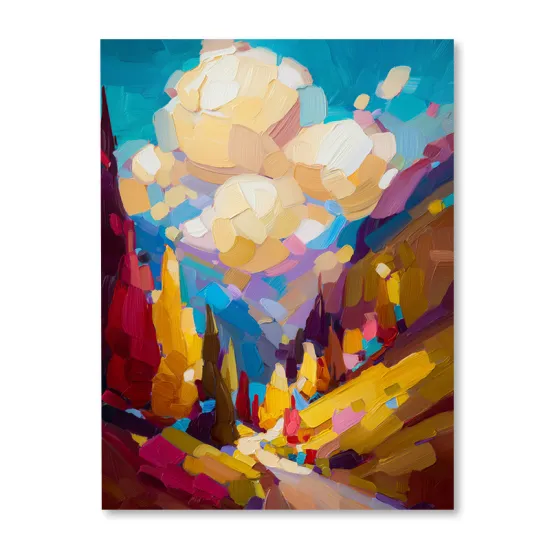 Abstrakcyjny obraz przedstawiający górski krajobraz. Wydruk w stylizacji farb olejnych. Ogromna szczegółowość wydruku w najdrobniejszym detalu robi niesamowite wrażenie.