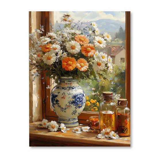 Obraz z motywem botanicznym przedstawiający kwiaty w wazonie przy oknie. Wydruk w stylizacji farb olejnych. Ogromna szczegółowość wydruku w najdrobniejszym detalu robi niesamowite wrażenie.