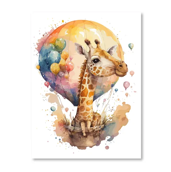 Obraz z motywem dla dzieci inspirowanym naturą. Przedstawia żyrafę lecącą balonem. Obraz w stylu akwareli.  Ogromna szczegółowość wydruku w najdrobniejszym detalu robi niesamowite wrażenie.