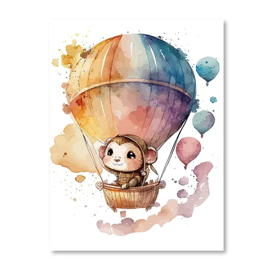 Obraz z motywem dla dzieci inspirowanym naturą. Przedstawia mysz lecącą balonem. Obraz w stylu akwareli.  Ogromna szczegółowość wydruku w najdrobniejszym detalu robi niesamowite wrażenie.