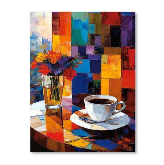 Obraz przedstawiający kompozycję z elementami kwiatów oraz kawy w filiżance idealnie nadającą się do kuchni lub jadalni. Wydruk w stylizacji farb olejnych. Ogromna szczegółowość wydruku w najdrobniejszym detalu robi niesamowite wrażenie.