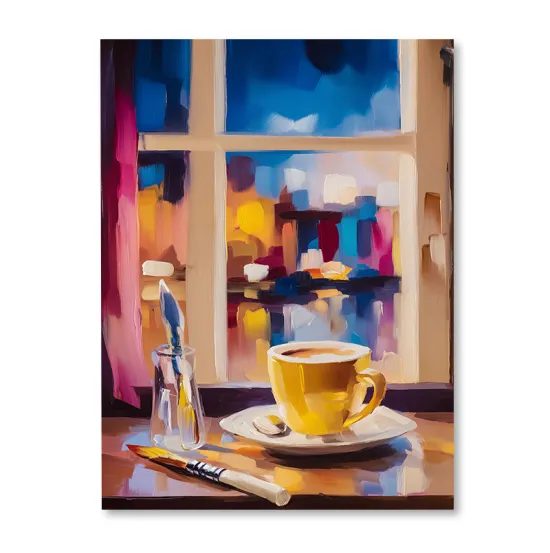 Obraz przedstawiający filiżankę kawy przy oknie w blasku świateł idealnie nadającą się do kuchni lub jadalni. Wydruk w stylizacji farb olejnych. Ogromna szczegółowość wydruku w najdrobniejszym detalu robi niesamowite wrażenie.