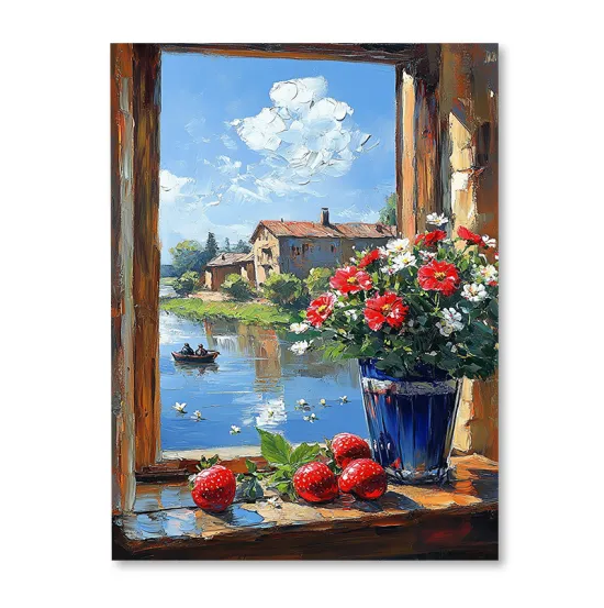Obraz przedstawiający kompozycję owoców przy oknie z widokiem na jezioro idealnie nadającą się do kuchni lub jadalni. Wydruk w stylizacji farb olejnych. Ogromna szczegółowość wydruku w najdrobniejszym detalu robi niesamowite wrażenie.