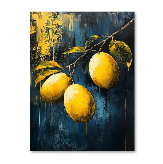 Obraz przedstawiający trzy cytryny na gałęzi idealnie nadającą się do kuchni lub jadalni. Wydruk w stylizacji farb olejnych. Ogromna szczegółowość wydruku w najdrobniejszym detalu robi niesamowite wrażenie.