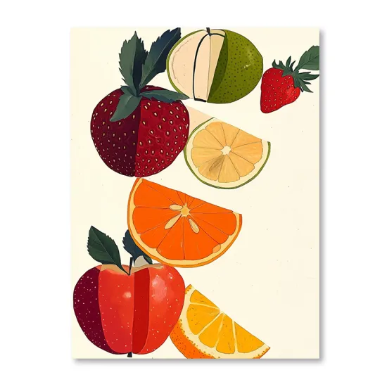 Obraz przedstawiający spadające owoce idealnie nadającą się do kuchni lub jadalni. Wydruk w stylizacji farb olejnych. Ogromna szczegółowość wydruku w najdrobniejszym detalu robi niesamowite wrażenie.