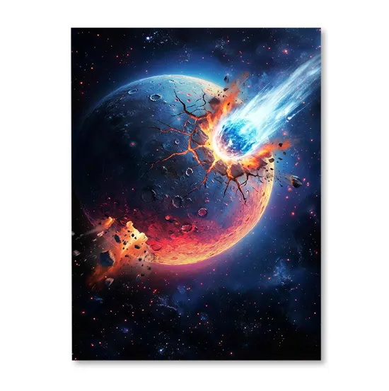 Obraz inspirowany zderzeniem planety z asteroidą. Wydruk w stylizacji farb olejnych. Ogromna szczegółowość wydruku w najdrobniejszym detalu robi niesamowite wrażenie.