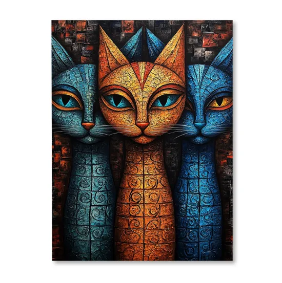 Obraz inspirowany kotami przestawia trzy koty o przenikliwym spojrzeniu. Wydruk w stylizacji farb olejnych. Ogromna szczegółowość wydruku w najdrobniejszym detalu robi niesamowite wrażenie.