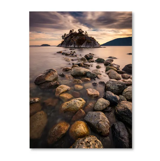 Obraz z motywem inspirowanym naturą. Przedstawia zachód słońca nad jeziorem i drogę z kamieni prowadzącą na wysepkę. Ogromna szczegółowość wydruku w najdrobniejszym detalu robi niesamowite wrażenie.