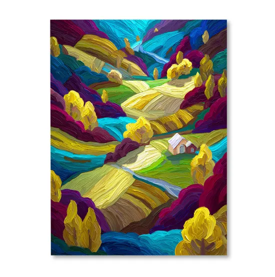 Obraz z motywem inspirowanym naturą przedstawiający dom w dolinie.  Ogromna szczegółowość wydruku w najdrobniejszym detalu robi niesamowite wrażenie.