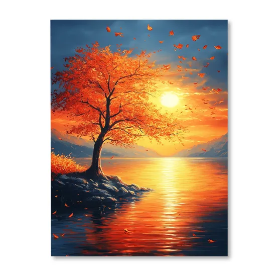 Obraz z motywem inspirowanym naturą przedstawiający pomarańczówe drzewo nad jeziorem.  Ogromna szczegółowość wydruku w najdrobniejszym detalu robi niesamowite wrażenie.