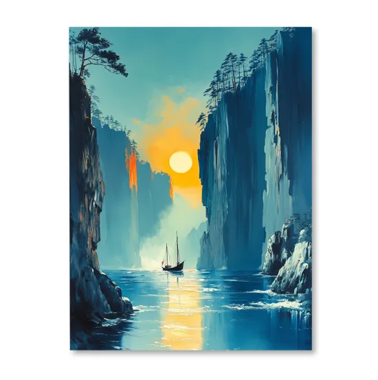 Obraz z motywem inspirowanym naturą przedstawiający okręt płynący pomiędzy klifami.  Ogromna szczegółowość wydruku w najdrobniejszym detalu robi niesamowite wrażenie.