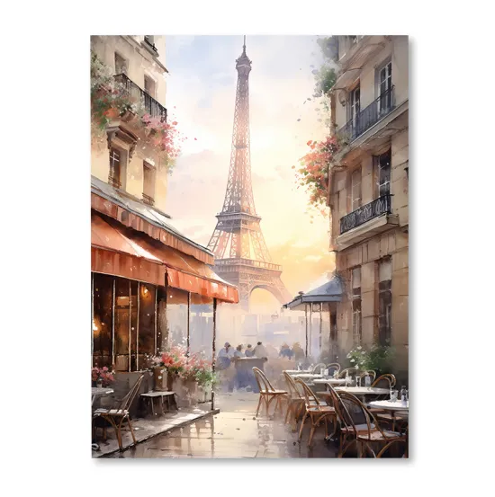 Abstrakcyjny obraz z motywem inspirowanym miastem miłości. Przedstawia poranek w Paryżu widziany z perspektywy ogródka restauracji z widoczną w tle wierzą Eiffla. Wydruk w ciepłych pastelowych barwach i stylizacji akwareli. Ogromna szczegółowość wydruku w najdrobniejszym detalu robi niesamowite wrażenie.