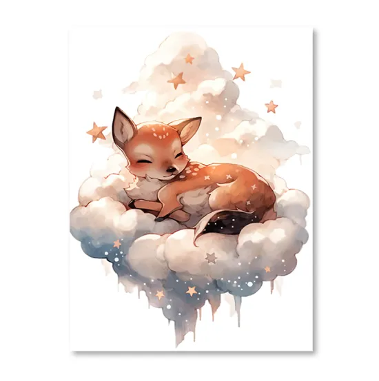 Obraz z motywem dla dzieci inspirowanym naturą. Przedstawia malutkiego jelonka śpiącego na chmurce pod tęczą.  Ogromna szczegółowość wydruku w najdrobniejszym detalu robi niesamowite wrażenie.