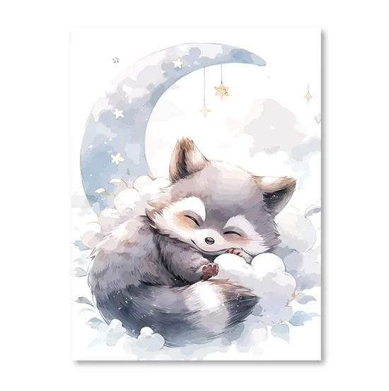 Obraz z motywem dla dzieci inspirowanym naturą. Przedstawia malutkiego szopa śpiącego na chmurce pod księżycem.  Ogromna szczegółowość wydruku w najdrobniejszym detalu robi niesamowite wrażenie.