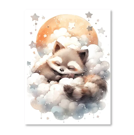 Obraz z motywem dla dzieci inspirowanym naturą. Przedstawia malutkiego szopa śpiącego na chmurce pod tęczą.  Ogromna szczegółowość wydruku w najdrobniejszym detalu robi niesamowite wrażenie.