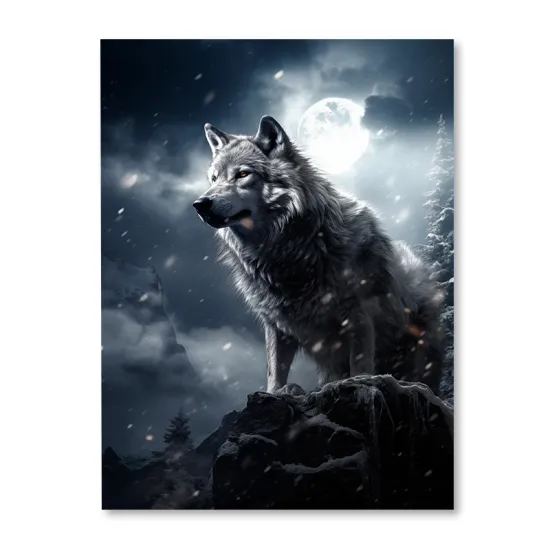 Obraz z motywem inspirowanym dziką naturą. Przedstawia wilka spoglądającego ze skały. W tle przepiękny zimowy, górski krajobraz oświetlony blaskiem księżyca. Opadające płatki śniegu w ruchu nadają wydrukowi wrażenie trójwymiarowości.